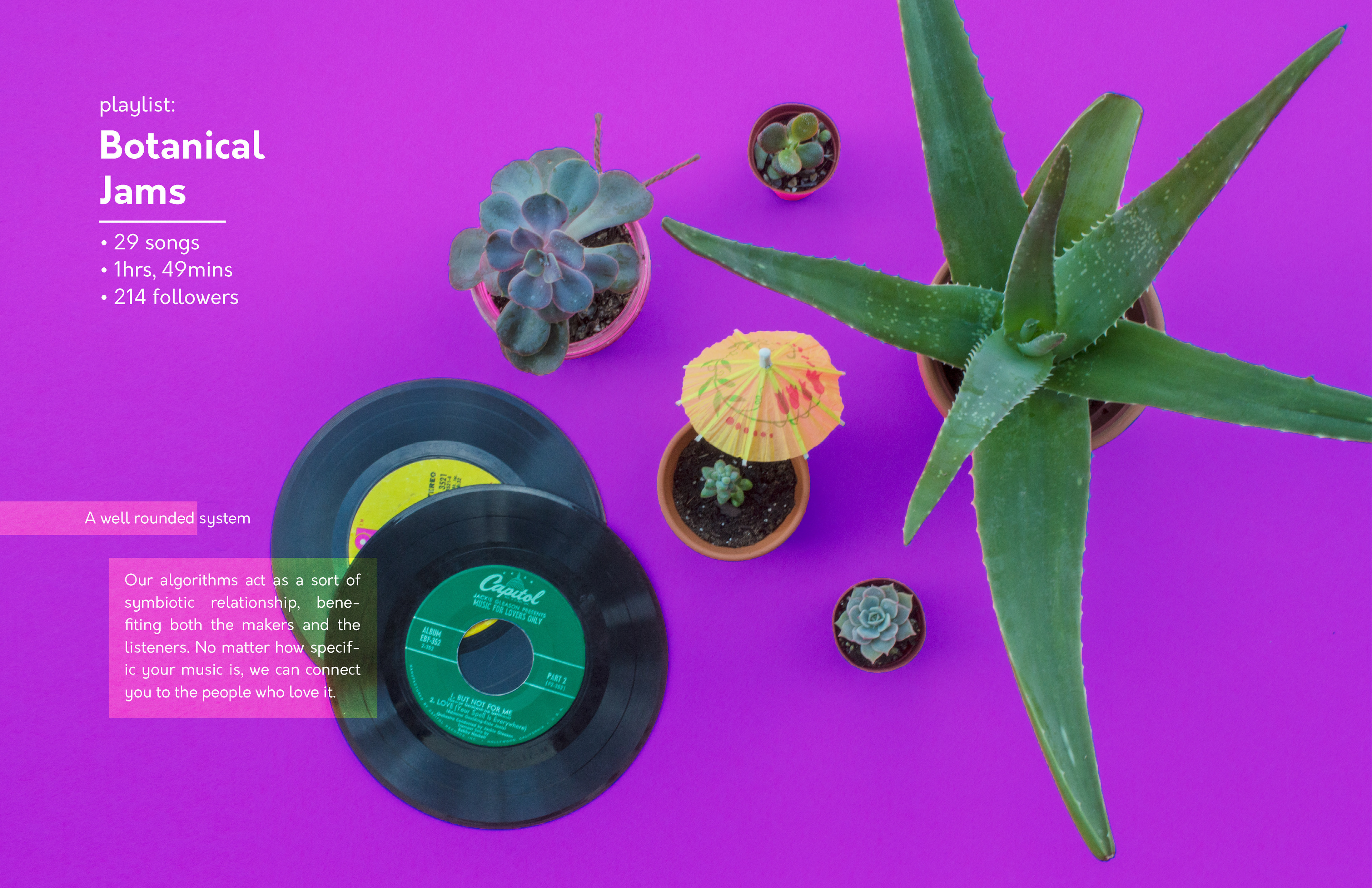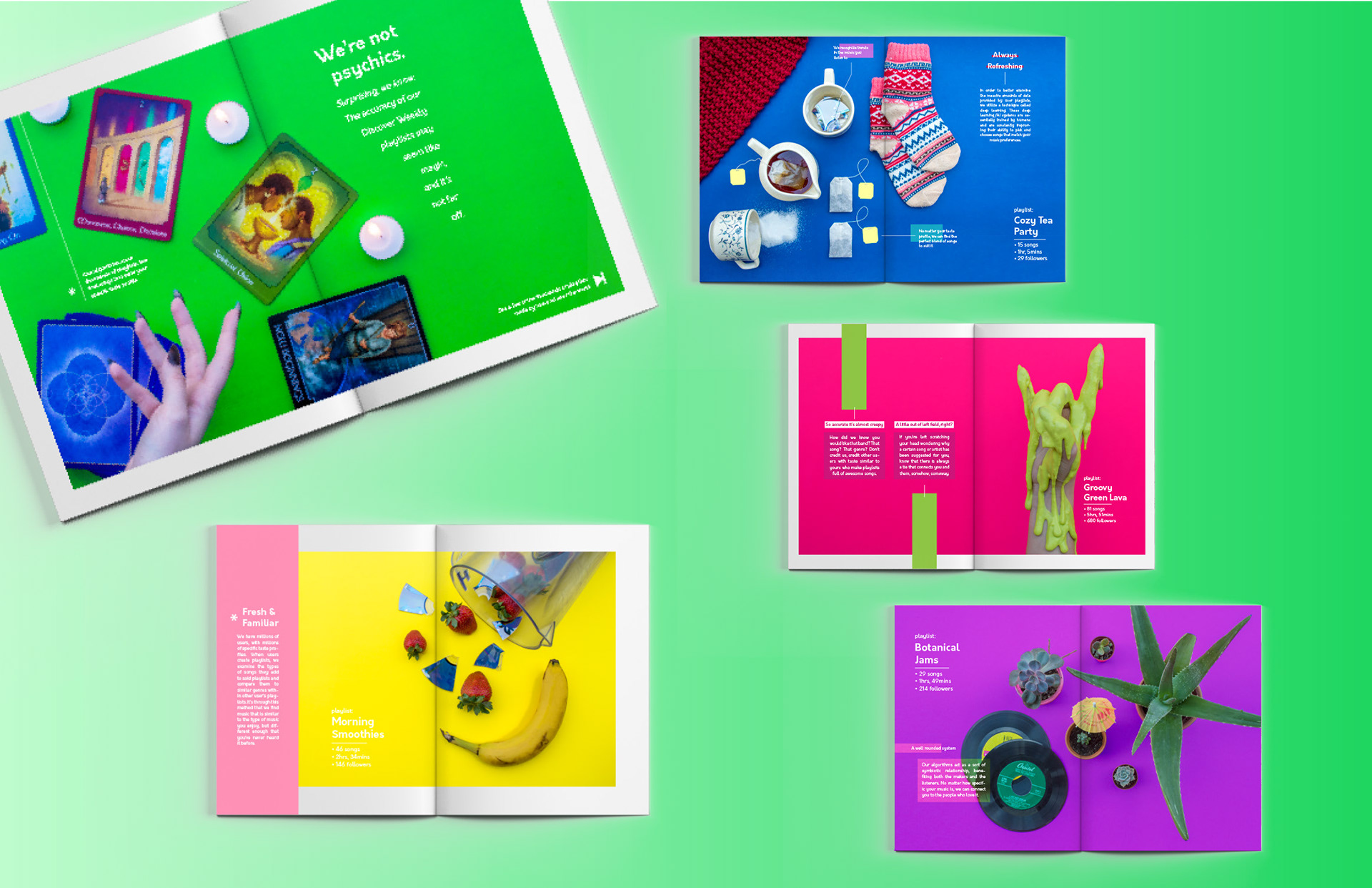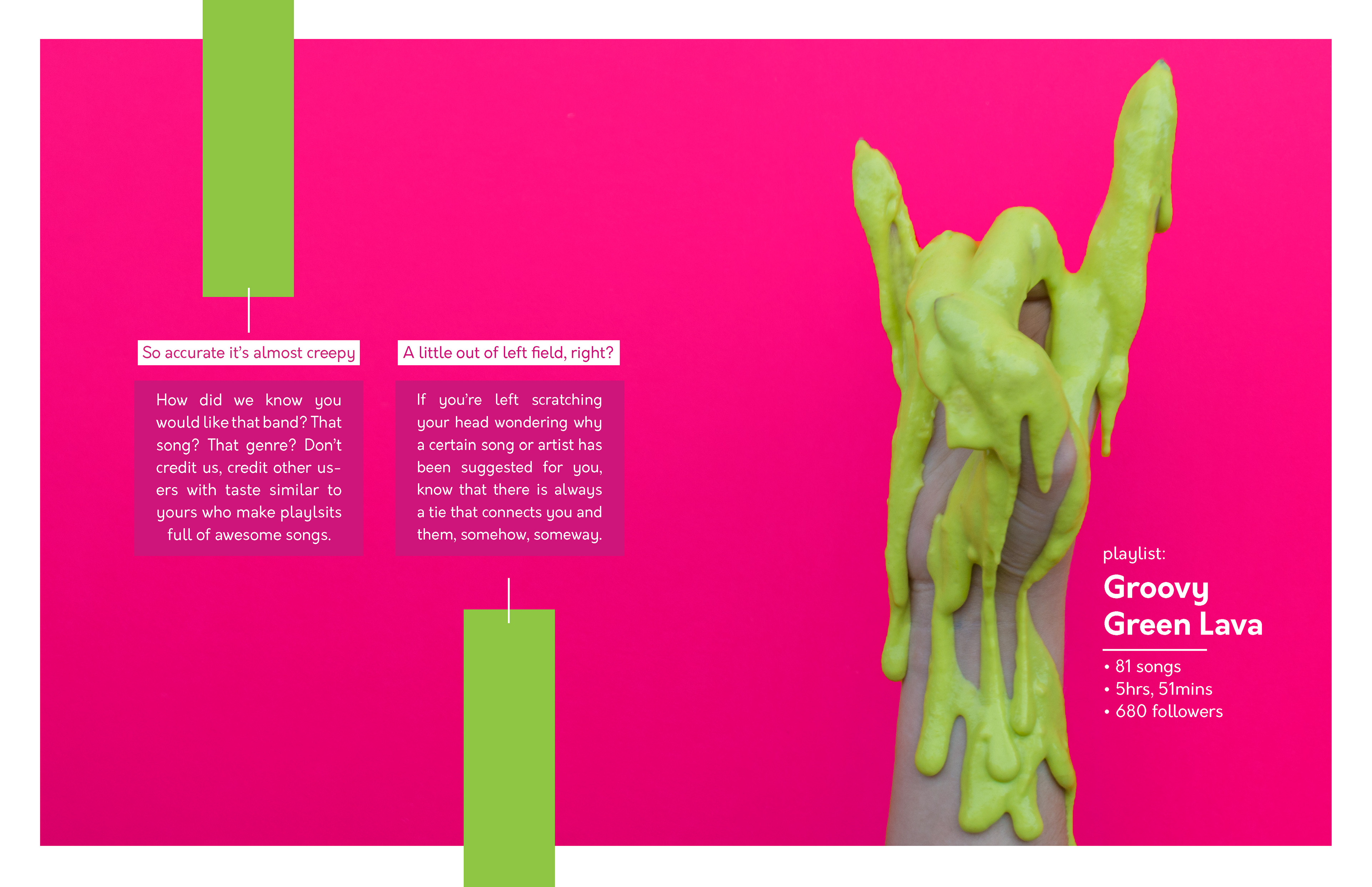 College Design Project: The goal of this project was to visually exemplify the complexity behind Spotify's various algorithms while simultaneously demonstrating the uniqueness of the user-made playlists across the platform. The spreads would act as a digital catalog that is presented to the user upon opening the app on desktop/mobile. It could also function as a print piece that could be sent out quarterly to subscribers. Information sourced from: Pasick, Adam. "The magic that makes Spotify’s Discover Weekly playlists so damn good" Quartz Media. December 21, 2015. https://qz.com/571007/the-magic-that-makes-spotifys-discover-weekly-playlists-so-damn-good/