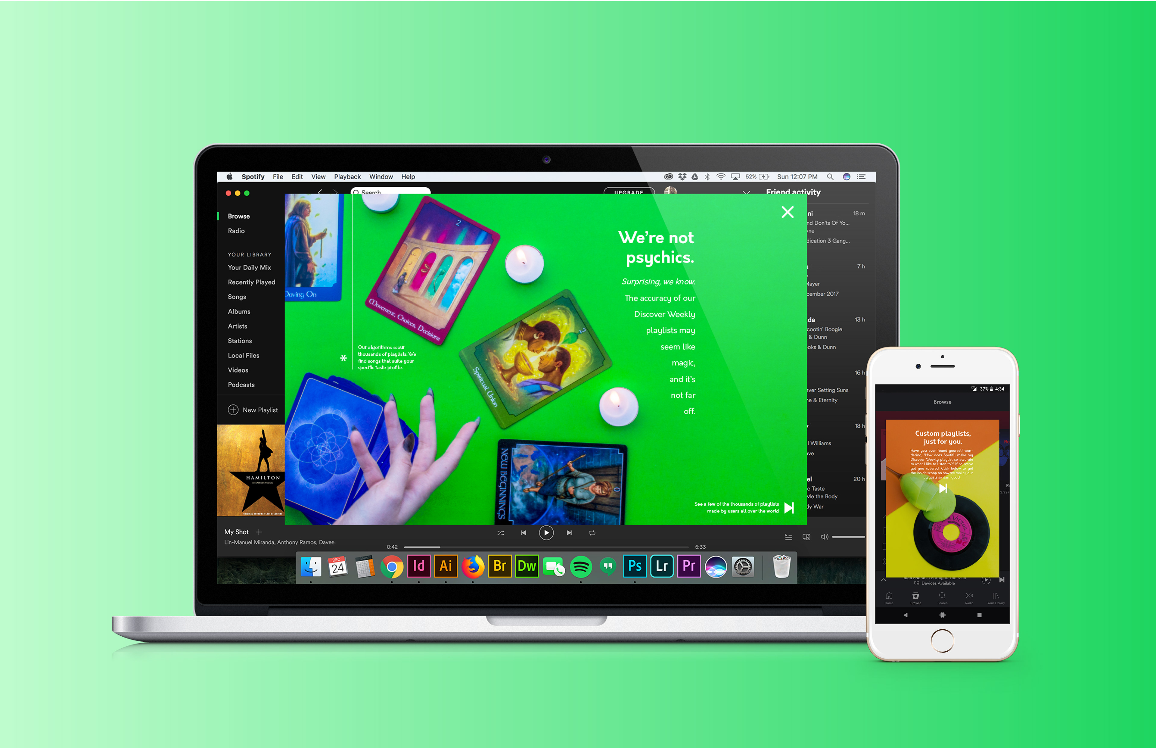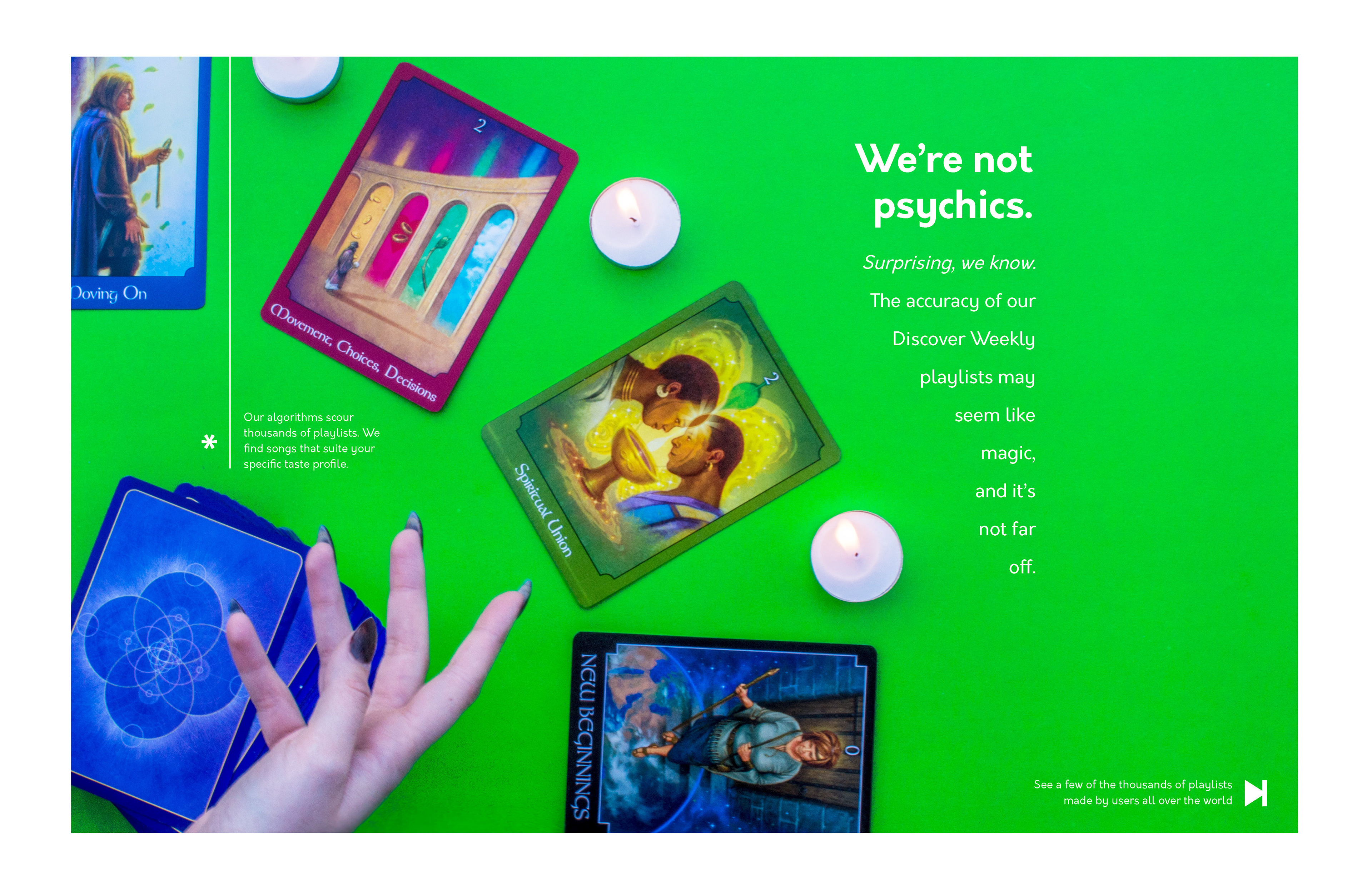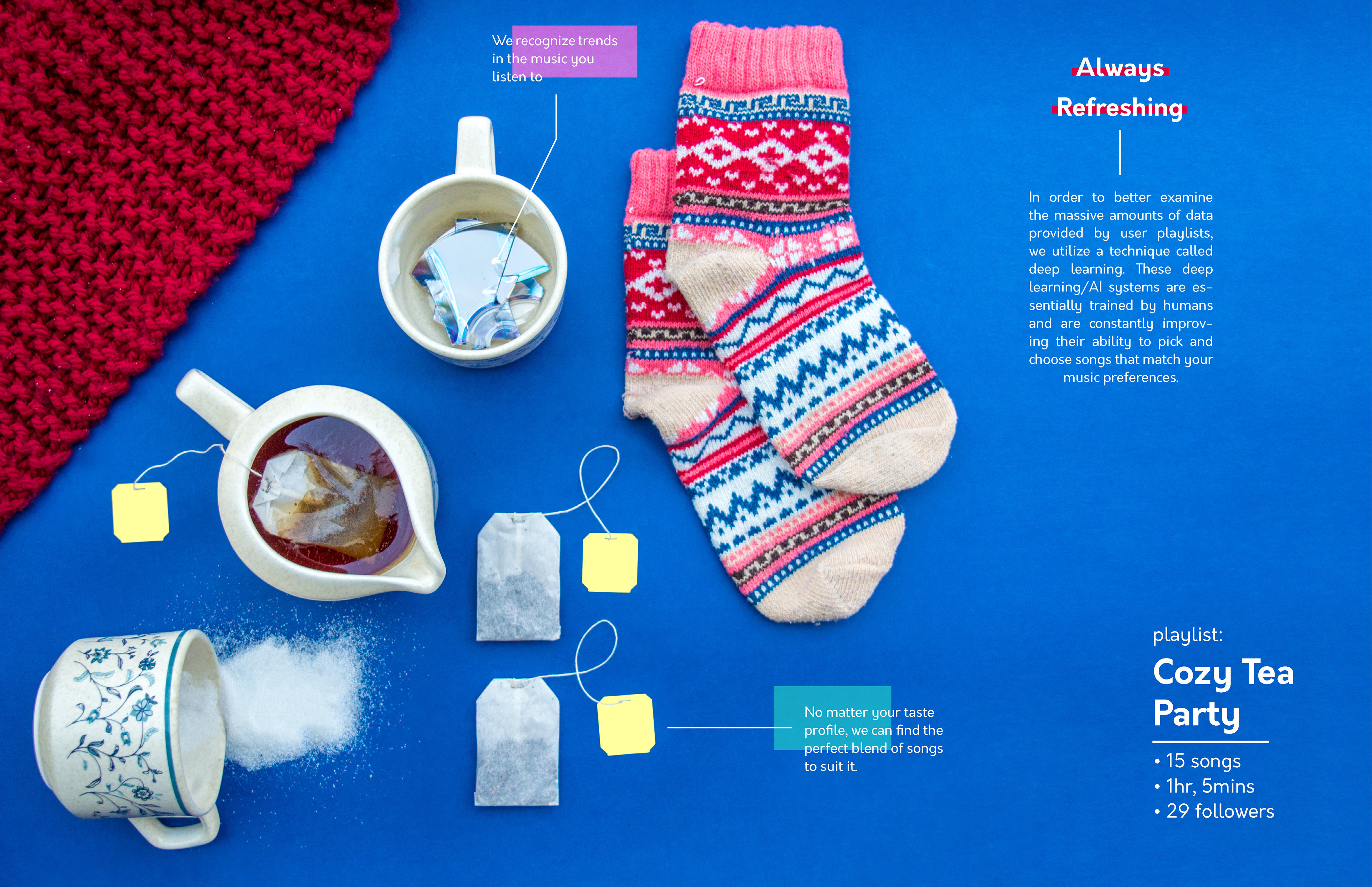 College Design Project: The goal of this project was to visually exemplify the complexity behind Spotify's various algorithms while simultaneously demonstrating the uniqueness of the user-made playlists across the platform. The spreads would act as a digital catalog that is presented to the user upon opening the app on desktop/mobile. It could also function as a print piece that could be sent out quarterly to subscribers. Information sourced from: Pasick, Adam. "The magic that makes Spotify’s Discover Weekly playlists so damn good" Quartz Media. December 21, 2015. https://qz.com/571007/the-magic-that-makes-spotifys-discover-weekly-playlists-so-damn-good/